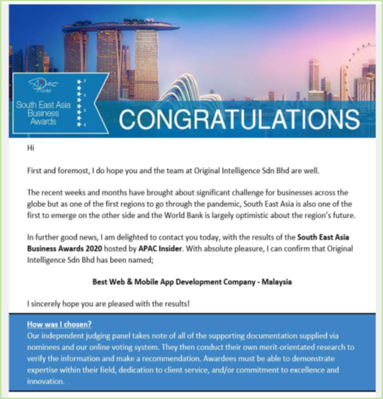 OI was awarded the Best Web & Mobile App Development Company in Malaysia by South East Asia Business Awards.